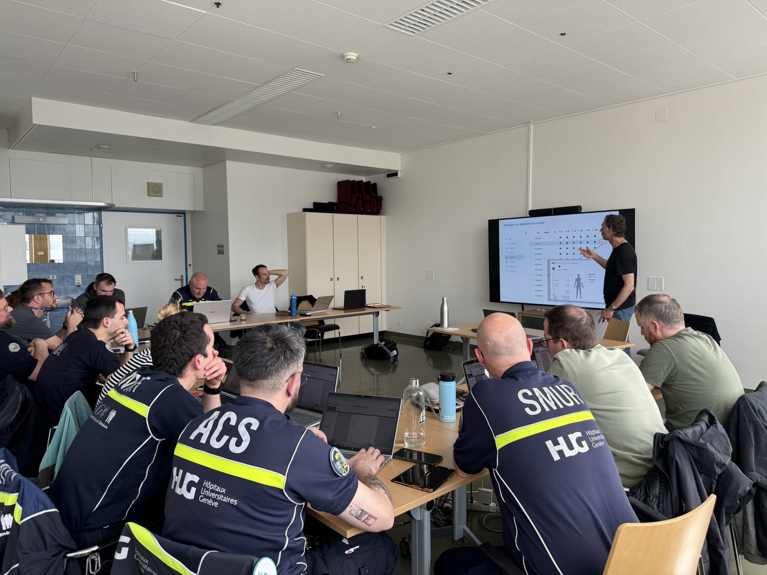 1st use of the “Patient Triage” module developed in the framework of the global project “Major Incidents Medical Simulation”. The simulation was used in the framework of a training session for doctors and paramedics of the HUG Emergency Medical Service (SMUR).